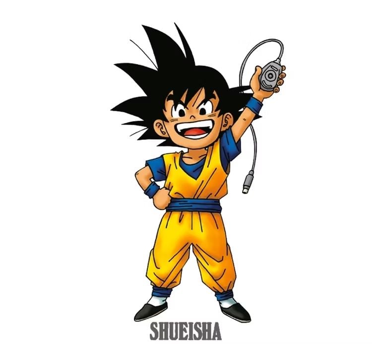 La imagen muestra a Goku sosteniendo un ratón de computadora con una expresión alegre y vivaz. Este dibujo no es simplemente una obra de arte, sino que fue originalmente un borrador para la portada de una guía de principiantes sobre cómo dibujar manga digitalmente. La colaboración, titulada Genius PC Cram School y publicada en 2002, unió a Toriyama y Oda, quienes se conocieron a lo largo de sus exitosas carreras en Shonen Jump.